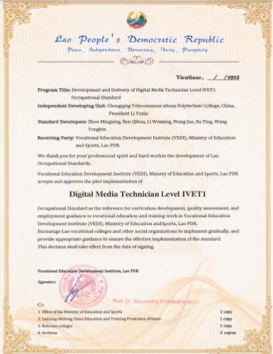 “老挝国家职业标准共建项目”由老挝教育体育部直属单位——职业教育发展研究院(VEDI)、澜湄-中国教育培训促进联盟发起,受老挝教育体育部职教司、中国-东盟商科职业教育联盟等支持。我校于2023年参与“老挝国家职业标准开发项目”,现已形成符合中国标准、满足老挝需求的数字媒体技术员职业标准,并配套提供与其相关的专业教学标准,获得了“老挝职业标准开发优秀建设单位”荣誉称号。