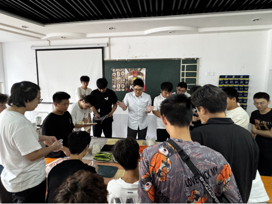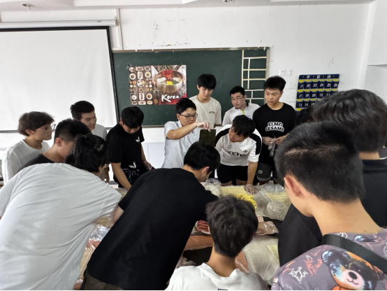 随后,学生们被分为若干小组,每组配备了新鲜的海苔、煮熟的米饭、黄瓜条、蟹肉棒、火腿等丰富食材,以及竹帘等制作工具。在朴老师的悉心指导下,大家纷纷卷起袖子,开始动手尝试制作属于自己的紫菜包饭。从铺平海苔、均匀铺上米饭,到精心摆放各式配料,再到小心翼翼地卷起并压实,每一步都凝聚着学生们的认真与热情。