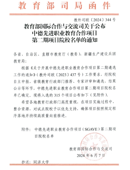 2024年6月7日,教育部国际合作与交流司发布《教育部国际合作与交流司关于公布中德先进职业教育合作项目第二期项目院校名单的通知》,我校大数据技术专业成功通过该项目遴选评估。本期申报院校共计361所,涉及478个申报项目,入选项目315个。