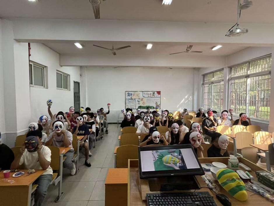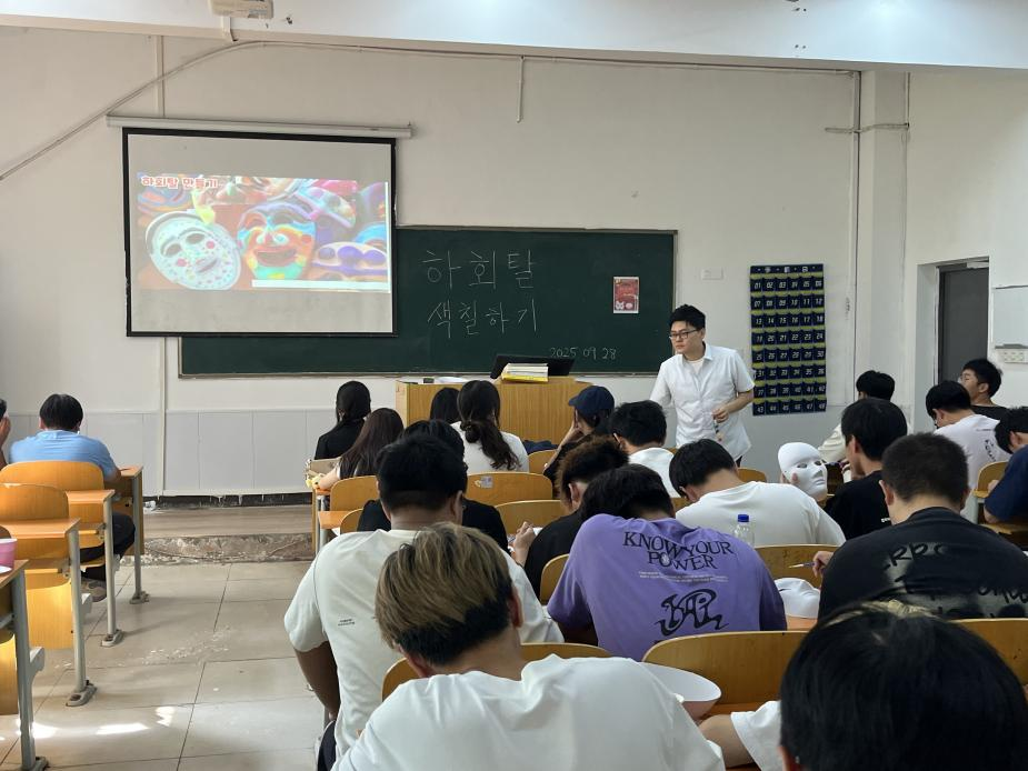 活动伊始,在外教生动有趣的讲解中,同学们深入了解了安东面具的历史背景、不同角色(如两班、贵族、僧侣、平民等)所代表的象征意义,以及其背后蕴含的韩国古代社会文化与哲学思想。同学们听得津津有味,对即将开始的动手体验环节充满了期待。