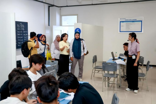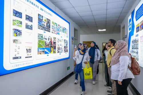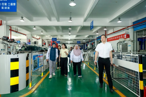 代表团在国际处工作人员的陪同下开启校园参观之旅。参观了华为开发者创新中心和智慧教室,了解我校在数字媒体、通信技术教学实践及人才培养方面的特色;走进汽车实训中心后,新能源汽车实训设备和校企合作实践模式引发外宾关注,让外宾对我校产教融合办学路径有了更直观的认识。